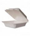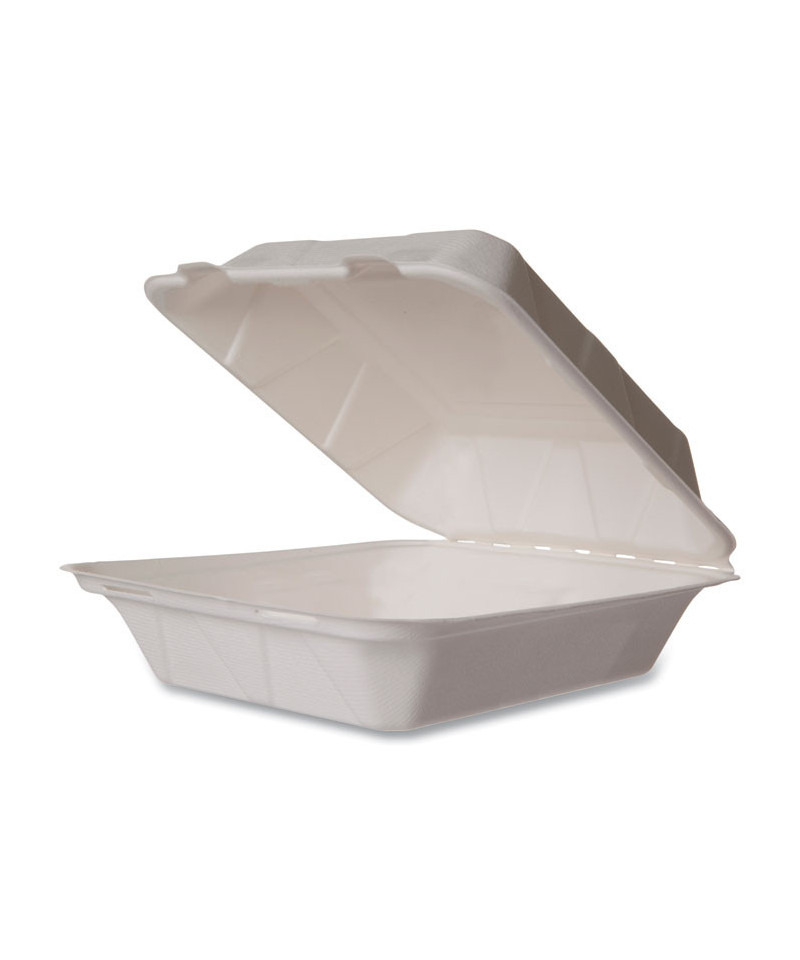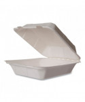 A hinged container with reliable performance. Great for hot or cold meals, and sturdy enough to load up with food. Made from molded sugarcane fiber, a reclaimed material with great thermal properties. Stylish white color. Made from plants. Award-winning quality by Vegware™.