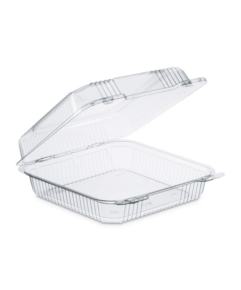 Clear hinged containers offer crystal clarity for excellent product visibility. Dual bar locks ensure a secure closure, even after multiple openings, while sidewall ribbing and chamfered corners increase strength and durability. Lightweight, crush-resistant and stackable. Serve multiple applications.