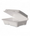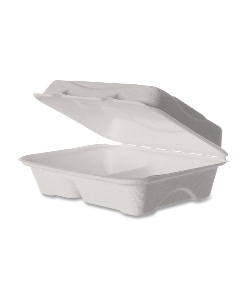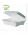 Eco-Products award-winning new line, Vanguard, is a collection of groundbreaking molded fiber clamshell containers. Vanguard products use FDA approved proprietary alternative compounds to achieve grease-resistance performance, without relying on conventional PFAS (Per- and polyfluoroalkyl substances). Made from reclaimed and rapidly renewable sugarcane fibers, this product meets BPI requirements for compostability certification. This recycled, disposable clamshell container is both hot and cold food friendly and microwave safe.