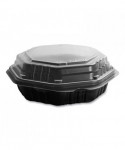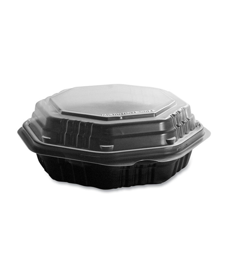 Unique octagonal design helps maximize portion-size perceptions. Hinged lid with Tear-Away perforations provides excellent carry-out protection and enhanced serving convenience. Top-oriented steam vents.