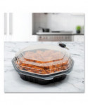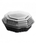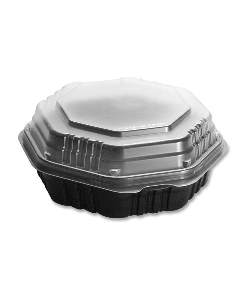 Unique octagonal design helps maximize portion-size perceptions. Hinged lid with Tear-Away perforations provides excellent carry-out protection and enhanced serving convenience. Top-oriented steam vents.