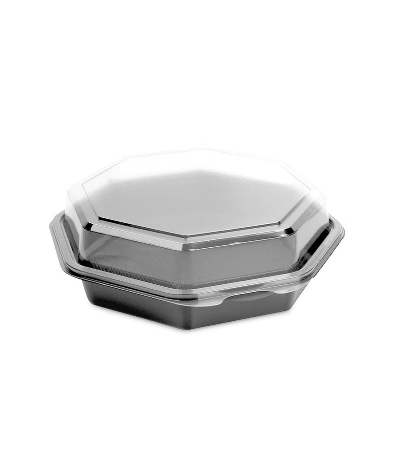 Hinged octagon to-go packages that do the selling for you. Consumers taste with their eyes before buying. This unique octagon design turns visual attraction into customer satisfaction. It boosts portion perception and drives impulse sales. Attractive black base and clear lid allow premium pricing with unmatched sales appeal. Creative Carryouts OctaView containers are the choice of choice for upscale and casual dining on the go.
