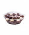 TamperAlert hinge protrudes outward when torn, alerting the customer that the container has been opened. Hinge remains attached to the container, meaning no loose plastic pieces and therefore no littering. MicroTrim edge contributes to tamper-resistance by inhibiting the ability to lift up the lid from the base without tearing the hinge. 360 degree leak-resistant perimeter seal completely seals entire tray for maximum freshness and to prevent leaks. Recessed stacking platform provides greater stability of merchandising displays. Offset opening tabs and lift and hold embossing makes SafeSeal bowls easier to open. Crystal clear container with minimal sidewall ribbing.