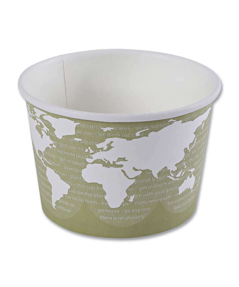 Eye-catching World Art™ design helps you make a better impression with customers and patrons. PLA-lined paper prevents leakage while ensuring 100% biodegradability. Reinforced seam provides extra strength.