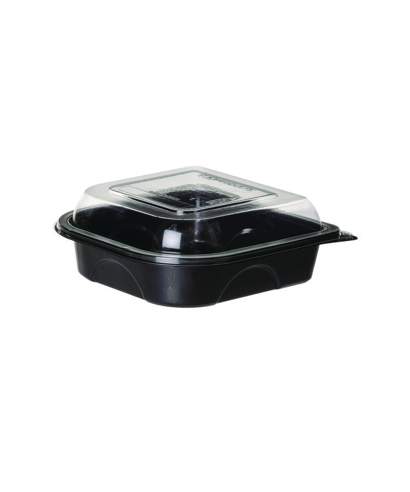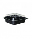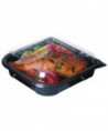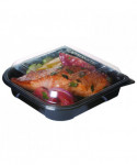 Stylish, attractive container may be used for hot or cold foods. Standard square/rectangular design accommodates a wide variety of to-go items. Clear lid with label panel simplifies order recognition.