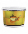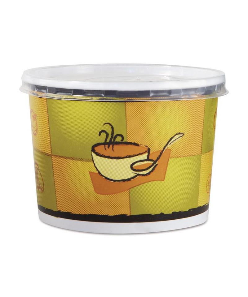 Attractive Streetside Pattern with White Lid—Bold, bright streetside pattern features utensil-and-bowl pattern and blends well in any foodservice establishment.