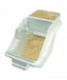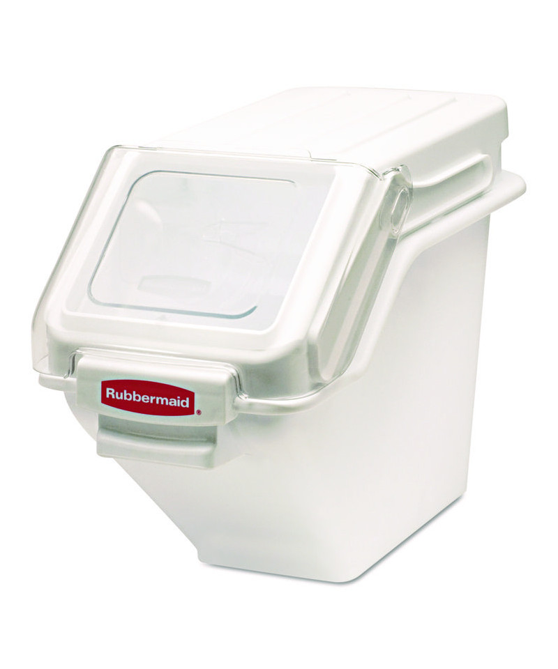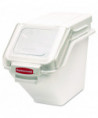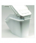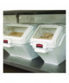 Patent-pending lid design enables quick, one-handed access to ingredients. FIFO (first in, first out) barrier simplifies stock rotation. Integrated measuring scoop stores inside the bin but above the bin's contents. Clear window and included ingredient labels help minimize confusion regarding contents. Stackable system allows you to optimize use of space and enhance workplace efficiency.