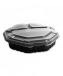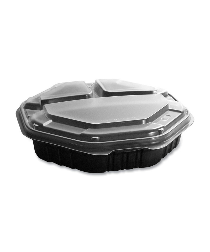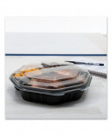 OctaView Hinged-Lid Hot Food Containers, 3 Compartments, 38 oz, 9.55 x 9.1 x 2.4, Black/Clear, Plastic, 100/Carton