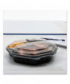 Unique octagonal design helps maximize portion-size perceptions. Hinged lid with Tear-Away perforations provides excellent carry-out protection and enhanced serving convenience. Top-oriented steam vents.
