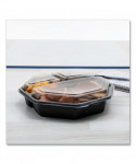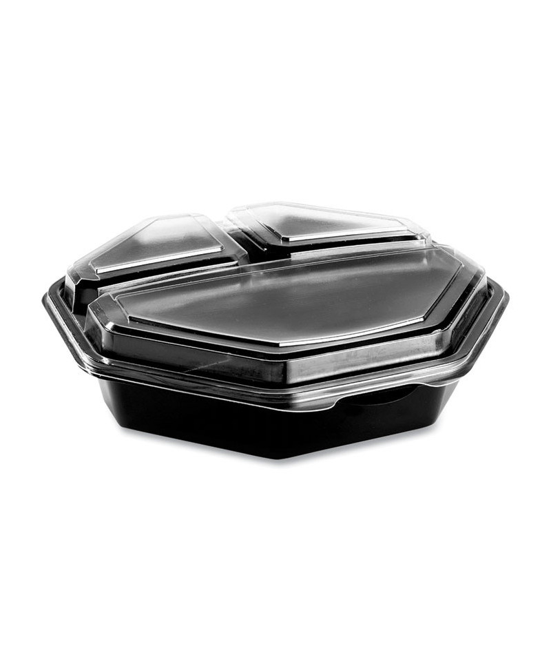 Contemporary, octagonal design draws extra attention to your delivery and carry-out items. Tear-Away perforations on the hinged lid simplifies serving. Leak-guard seal.