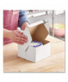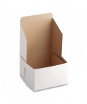 The bakery box is made from high quality paperboard that is white on the outside and Kraft on the inside. Perfect for cakes, pastries, pies and cupcakes. The white, clay-coated exterior accepts a printed logo or business name. Each one-piece box ships flat for transport and storage, but assembles easily into a folded carton with lock-corner closures and a tuck top to secure contents.
