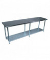 This work table features an 18-gauge T-304 stainless steel top, complete with turndown edges on all sides for added durability. Reinforced with channels, the table ensures stability and strength. It comes with an adjustable galvanized undershelf for convenient storage. The table is supported by four 1.63" diameter galvanized legs, each equipped with adjustable high-impact corrosion-resistant feet, providing a sturdy and reliable work surface.
