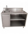 This beverage table is equipped with a robust 14-ga stainless steel top and an 18-ga stainless steel body, ensuring durability and longevity. It features a 14" x 10" sink with a BKF-4DM-5G-G gooseneck faucet for efficient water access. The stainless steel cabinet provides stable support, while a 5" riser backsplash incorporates a standard electric outlet for added convenience. The table includes a built-in urn trough with a drain to manage drips and spills effectively. A hinged door under the sink enhances accessibility, and an adjustable shelf offers additional storage flexibility.