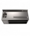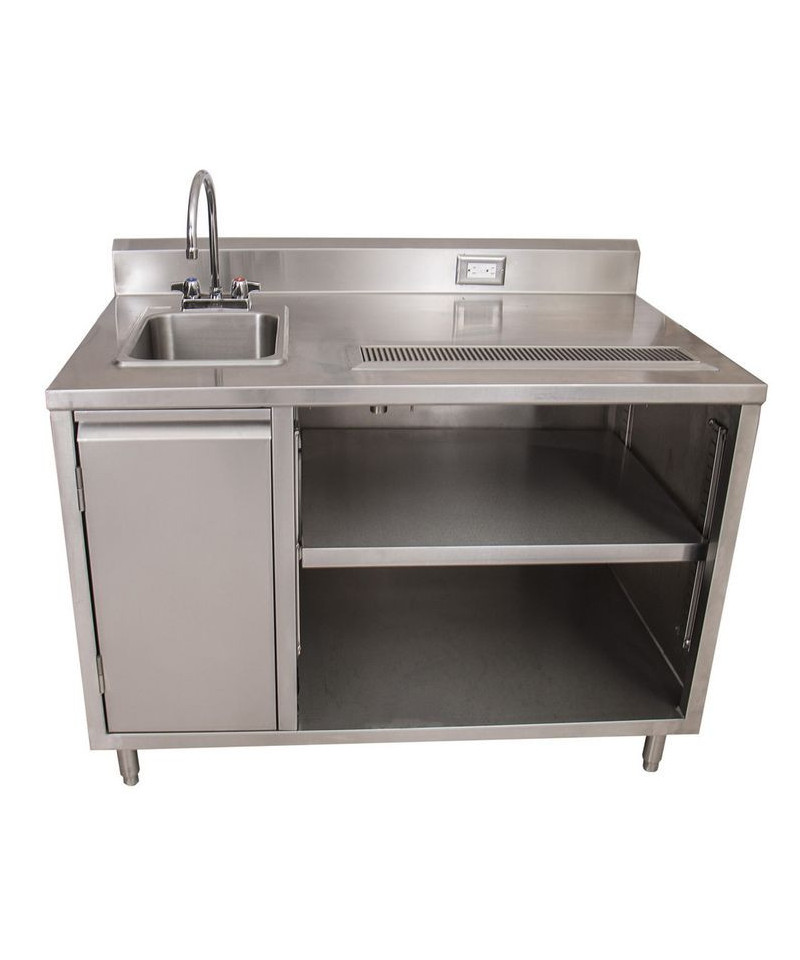 This beverage table is equipped with a robust 14-ga stainless steel top and an 18-ga stainless steel body, ensuring durability and longevity. It features a 14" x 10" sink with a BKF-4DM-5G-G gooseneck faucet for efficient water access. The stainless steel cabinet provides stable support, while a 5" riser backsplash incorporates a standard electric outlet for added convenience. The table includes a built-in urn trough with a drain to manage drips and spills effectively. A hinged door under the sink enhances accessibility, and an adjustable shelf offers additional storage flexibility.