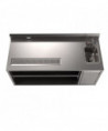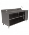 This beverage table is equipped with a robust 14-ga stainless steel top and an 18-ga stainless steel body, ensuring durability and longevity. It features a 14" x 10" sink with a BKF-4DM-5G-G gooseneck faucet for efficient water access. The stainless steel cabinet provides stable support, while a 5" riser backsplash incorporates a standard electric outlet for added convenience. The table includes a built-in urn trough with a drain to manage drips and spills effectively. A hinged door under the sink enhances accessibility, and an adjustable shelf offers additional storage flexibility.