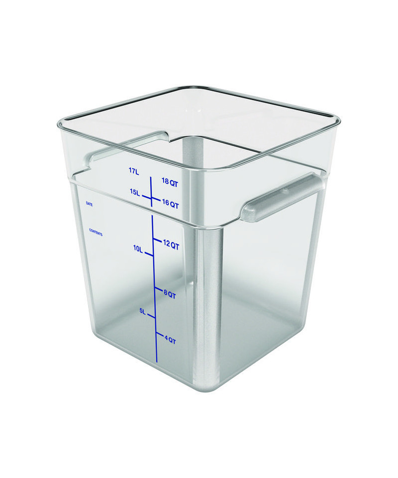 Maximize storage space for a variety of items in Carlisle Squares food storage containers! Tight fitting, color-coded lids (sold separately) encourage organization and reduce cross-contamination. Color-coded liter and quart markings match color-coded lids to ensure a quick and easy match. Keep food organized and separated for sanitary storage.