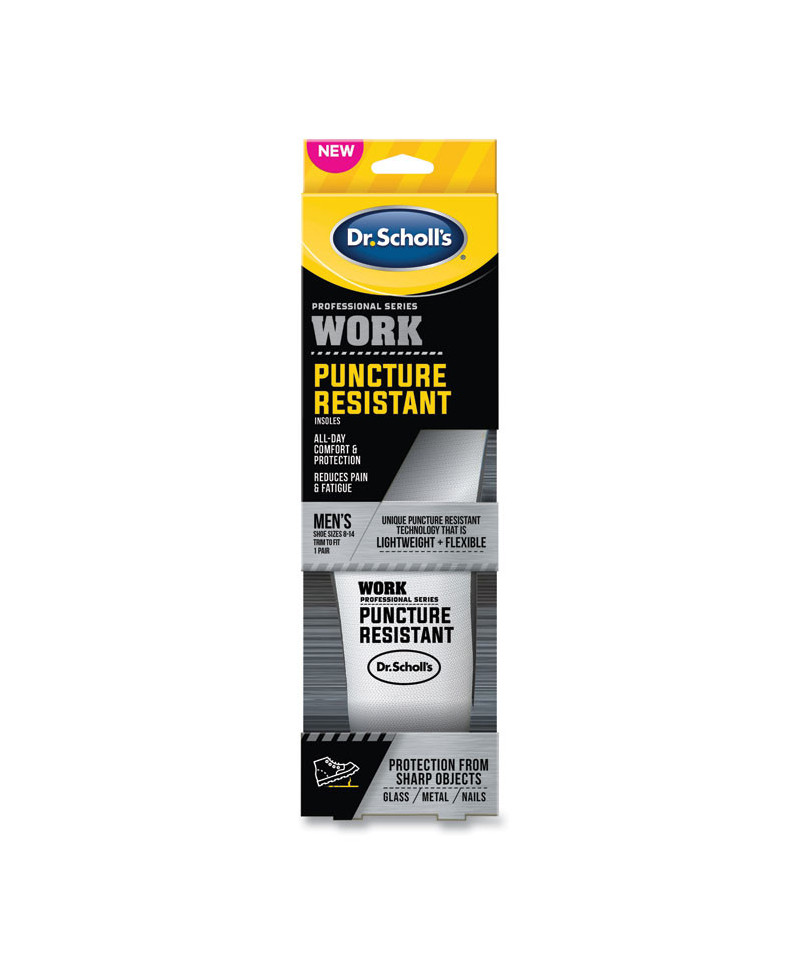 Dr. Scholl's Professional Series Work insoles use our proprietary 3D-formed Ballistic Fabric Material to provide puncture resistance from scrap metal, screws, nails and other hazards, without needing to invest in specialized footwear. The proprietary 3D shaping of the ballistic fabric provides expanded coverage of the arch and heel area from punctures.The insoles feature our famous Dr. Scholl's ergonomic contour foot bed and arch support, proven to provide all-day comfort. The dual-layer insole features a top layer of our Gel-Foam for added comfort.