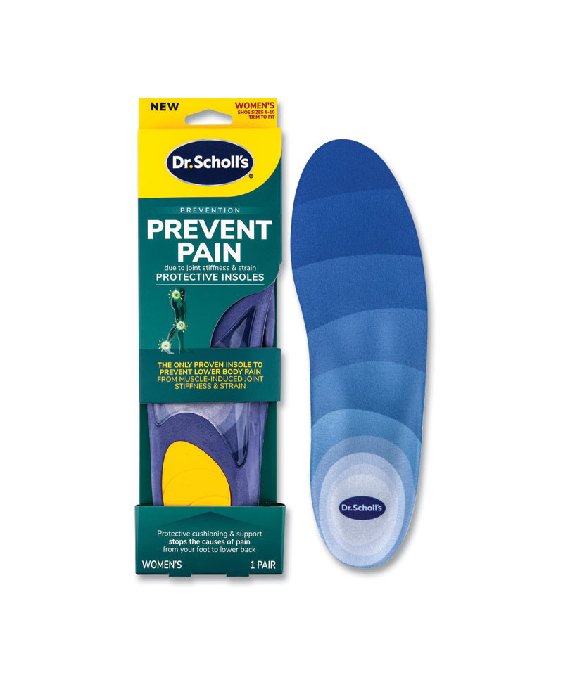 Dr. Scholl's® Prevent Pain protective insoles are designed for those who have had prior episodes of daily pain and want to stop it from reoccurring, or want to be proactive and help stop pain from occurring in the future. The new Prevent Pain insoles are scientifically designed and clinically proven to reduce the leading cause of pain in key lower body joints—your foot, knee and lower back from reoccurring. Dr. Scholl's® Prevent Pain Insoles prevent pain from muscle-induced joint stiffness and strain caused by conditions or activities like recent reduction in activity or weight gain, flat feet, overpronation, over-supination, bad posture, heavy or uneven pressure, and working, walking, or running on hard surfaces.