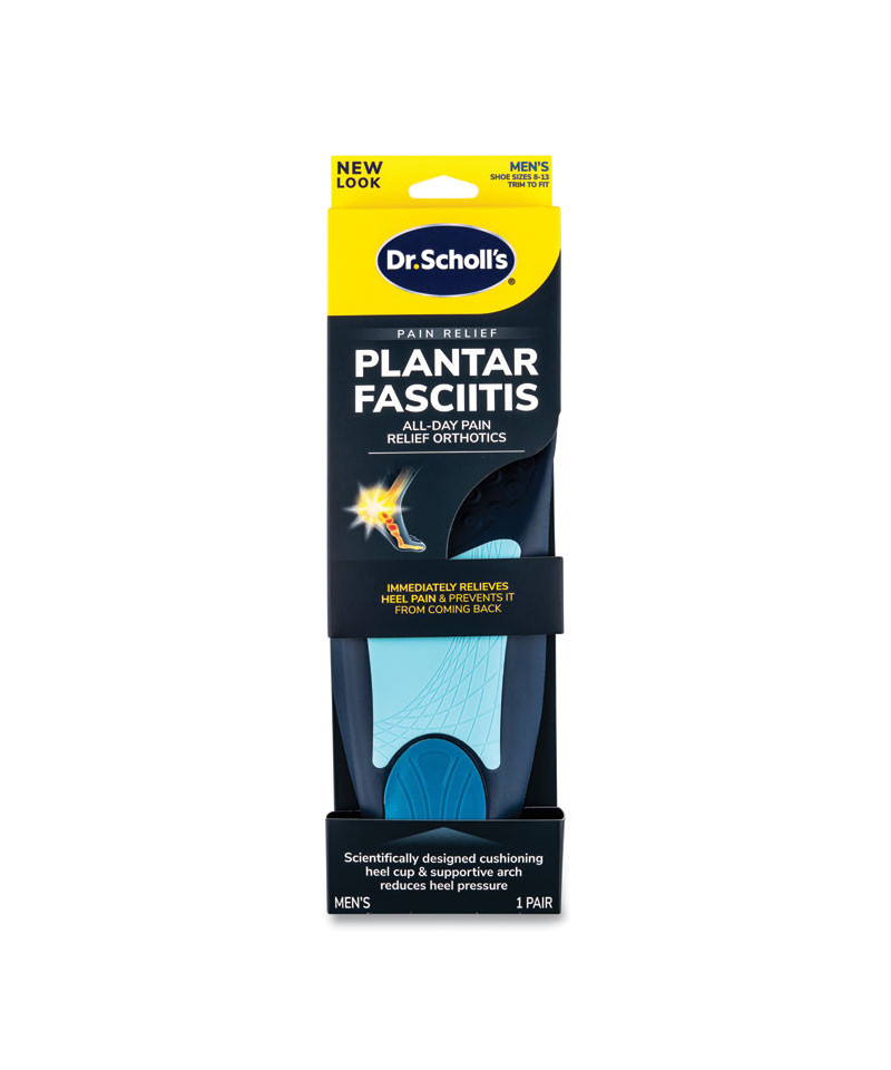 Plantar fasciitis occurs when the band of tissue along the underside of your foot, called the plantar fascia, is overstretched and aggravates the attachment at the heel bone. This can cause pain with every step you take. Dr. Scholl's® Plantar Fasciitis All-Day Pain Relief Orthotics provide relief by treating the source of your pain. The insoles absorb aggravating shock impact, comfort and protect your foot with added cushioning, and support your arch to prevent the plantar fascia from stretching further so it can heal.