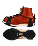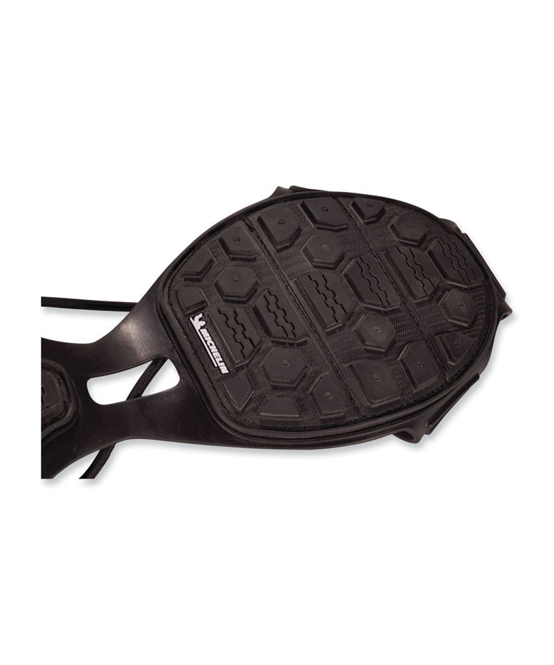 TREX Spikeless Traction Devices for shoes reduce the risk of slips and injuries by providing spike-free traction on slick surfaces. Powered by Soles by Michelin, these are the industry's most advanced spikeless traction device. Designed for work environments where spiked ice cleats are not preferred, these shoe and boot grips make for easy and safe transition between indoor and outdoor. To achieve traction without spikes, the treads are constructed with a Michelin ice control compound, the same innovative technology found in their winter driving tires. Strategically placed grooves allow for efficient water evacuation when pressure is applied. Preventing water build-up is particularly beneficial on smooth indoor surfaces. Micro-pumps increase adhesion by properly distributing pressure to maintain high surface contact on icy surfaces. The tread is designed with block springs that create additional surface area for increased grip on snowy surfaces.