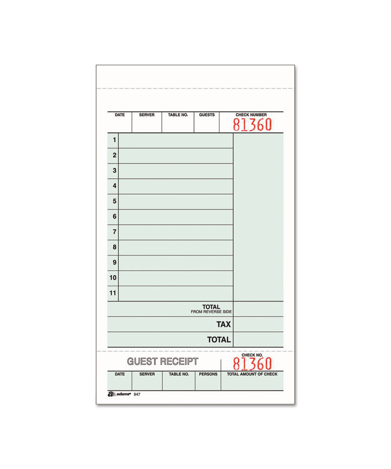 A service-industry standard, Adams® Multi-Part Guest Checks are ideal for capturing your guests' food and beverage orders. Consecutively numbered, each check's front features plenty of space to capture the food-menu selections as well as the server, table and number-of-guests details, while the back of the original allows you to capture your guests' beverage orders. Carbonless, multipart format and a perforated stub on the original allows you provide a copy to your kitchen for food orders, a receipt-stub to your guest and keep the original for yourself. Original is printed on bond-weight paper; copies are printed on heavyweight tag.