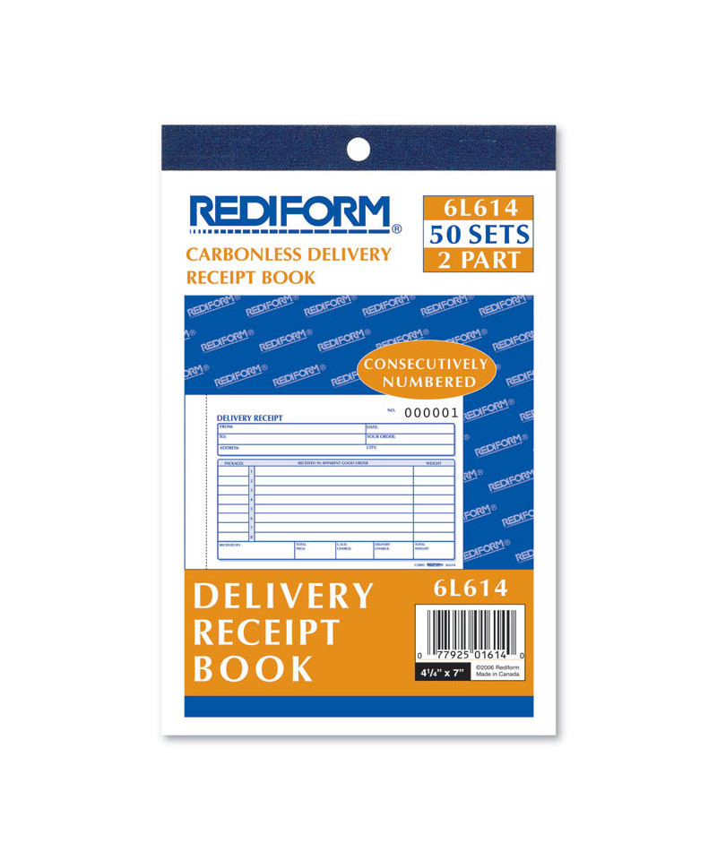 The Rediform Delivery Receipt Book is two-part carbonless with first copy white and second copy canary yellow. Consecutively numbered with eight entry lines. Includes stop card to prevent write-through. Hole-punched for storage. The receipt book is an essential tool for cash payments and is also useful for income tax purposes. Rediform brand business forms represent the most professional way to do business. All our carbonless business forms are manufactured with high-quality papers for a sharp and clear image reproduction, faithful to the original.