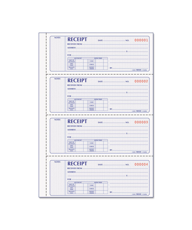 Add to cart Receipt Book, 7 x 2 3/4, Triplicate with Carbons, 200... $26.59 Security screen protects against alteration. Consecutively numbered in red. Red, white and blue color scheme.