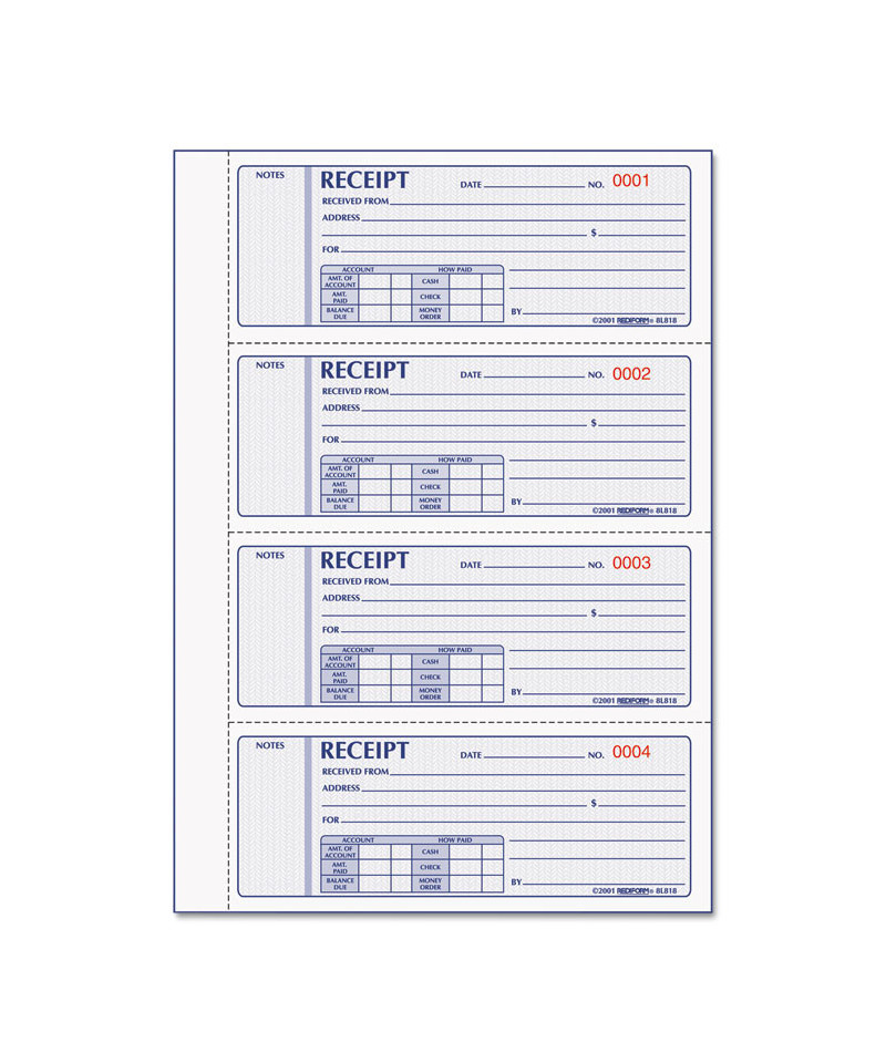 Add to cart Receipt Book, 7 x 2 3/4, Triplicate with Carbons, 200... $26.59 Security screen protects against alteration. Consecutively numbered in red. Red, white and blue color scheme.