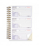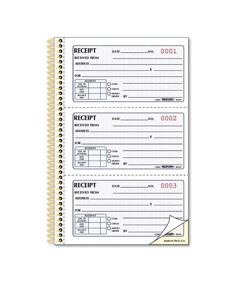 Safety tint on original rubs off if erased. Coordinating gold twin-wire binding allows book to lie flat when open. Attached stop card prevents write-through onto other receipts and is always handy. Account and check-off boxes for cash, check, money order.
