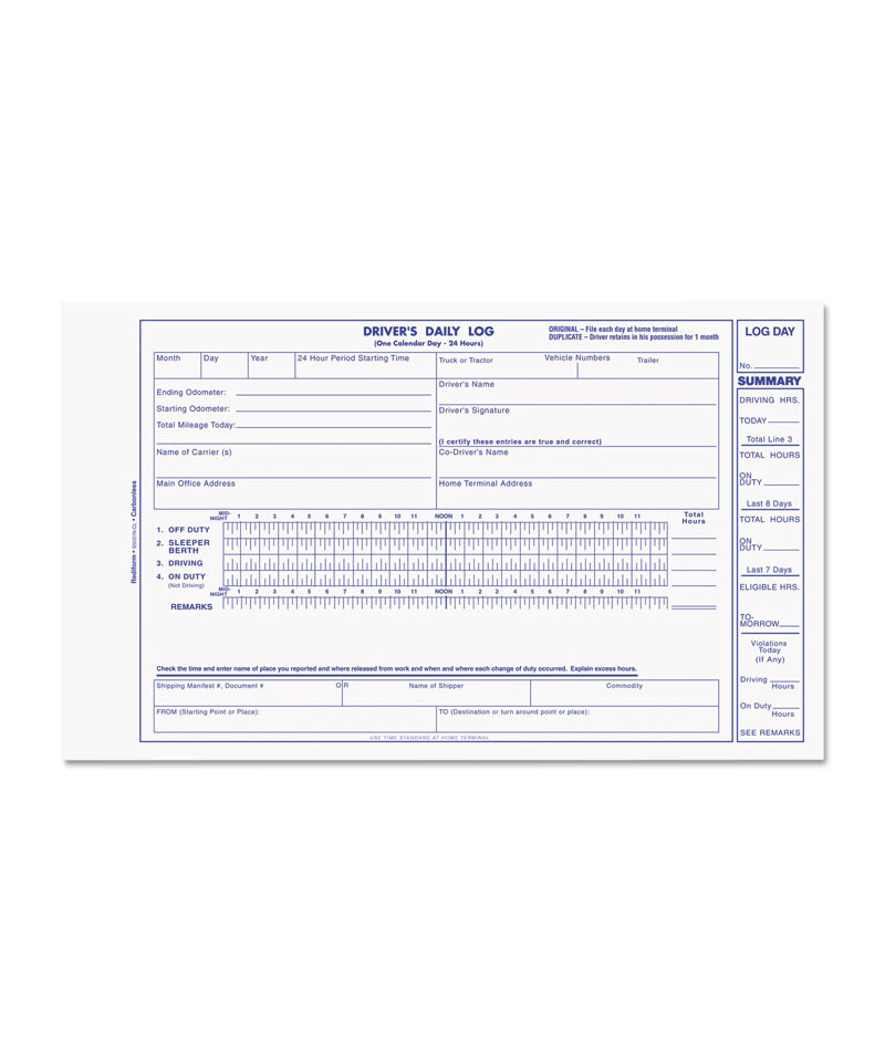 Log a day's driving summary in separate section at right side of each form. Vehicle report on back of original with odometer start and finish, mileage today, time in, stops, time out, layover time, daily vehicle inspection report.