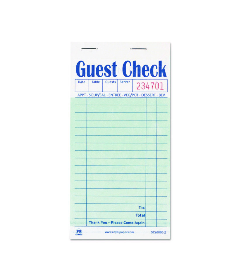 Combination order book/customer receipt pad helps keep wait staff organized and efficient. Menu prompts provide a convenient reminder to service professionals, making it easier to maximize each table's order potential. Wider ruling delivers ample space for order itemization and notation.