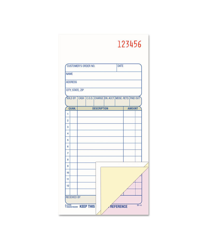 Perfect for keeping hard copy records of your sales, the Adams® Multipart Sales Order Pad features preprinted layout prompts for all the important details. With entry areas for point of sale, customer, order, terms information and more, anything one might wish to capture can easily be accommodated. Open area at top provides space for your company's logo, and the order form's carbonless, multipart format lets you provide a receipt to your customer while keeping clean, administrative copies. The pad's wraparound cover also allows you to place the front cover between sets as you fill out a form, minimizing the potential for write-through.