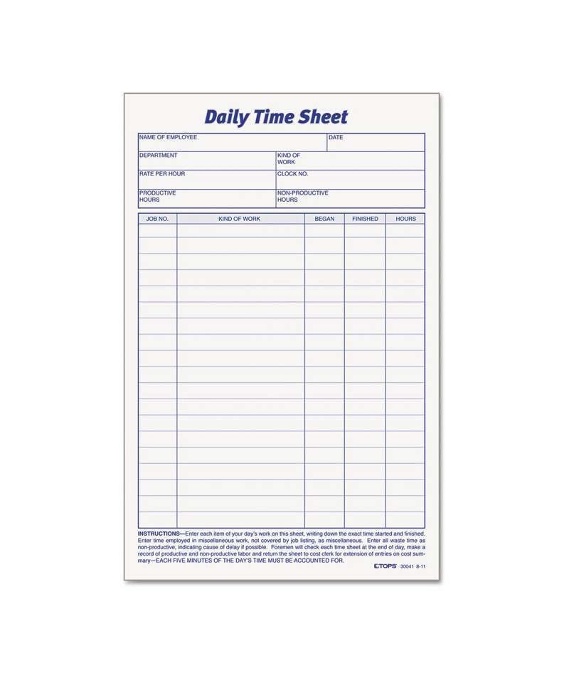 For daily manual time record keeping. Columns for job number, kind of work, time begun, time finished and total hours. Room for employee name, department, rate per hour, productive hours and non-productive hours. Two pads per pack.