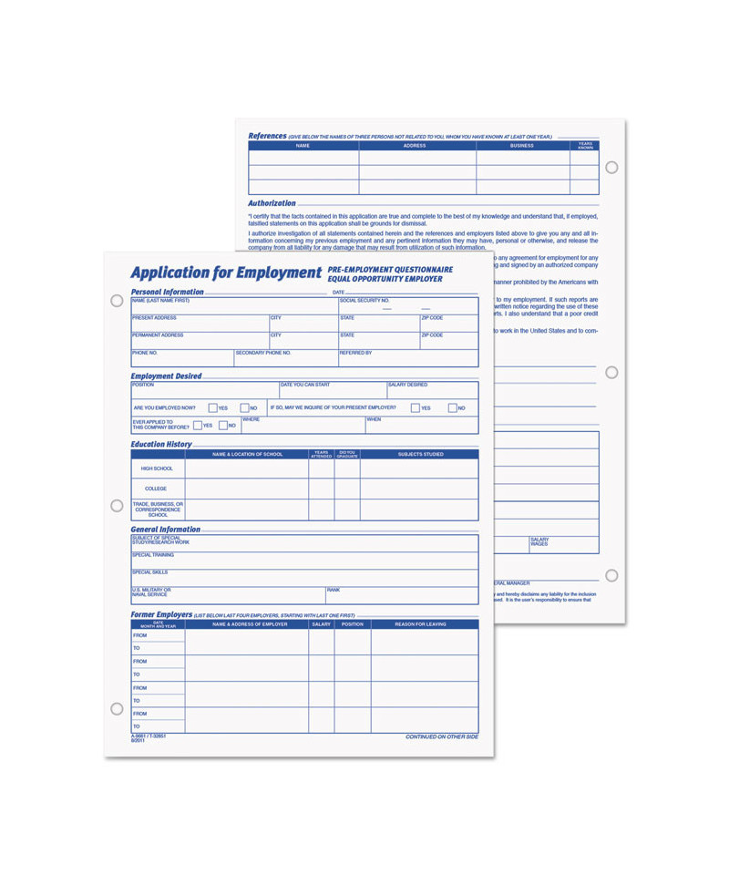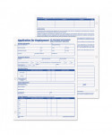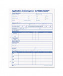 Complies with state and federal laws prohibiting discrimination. Employment history, references, education, personal information, physical record and check-offs for special questions. Two-sided comprehensive form. Two pads per pack. Space for interviewer's remarks.