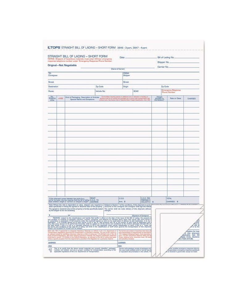 Adaptable to all types of shipments to any location in the country. Simplified form to itemize 16 articles. Headings for article descriptions, shipping units, weight, rate and charges.