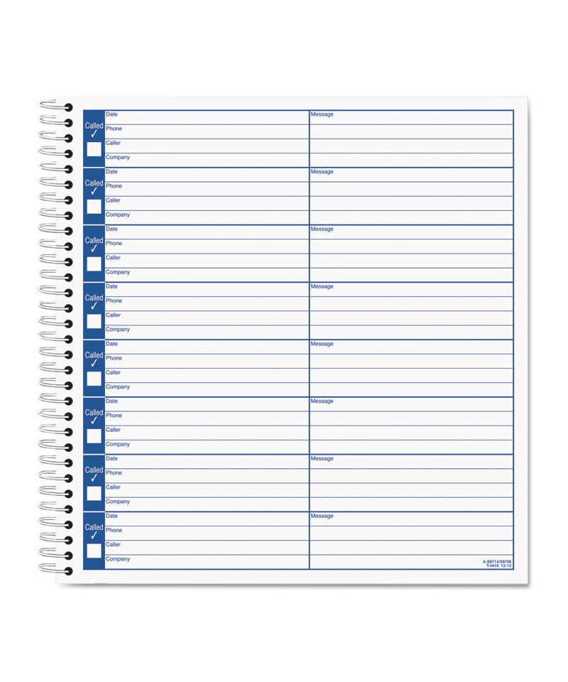 Slim spiralbound books conserve space; tote in briefcase, time management organizer or glove compartment. Provides accurate log of retrieved messages. Handy check-off box indicating returned messages, providing a quick visual reminder of pending work. Printed on heavyweight bond to prevent bleed-through. Date register on front cover.