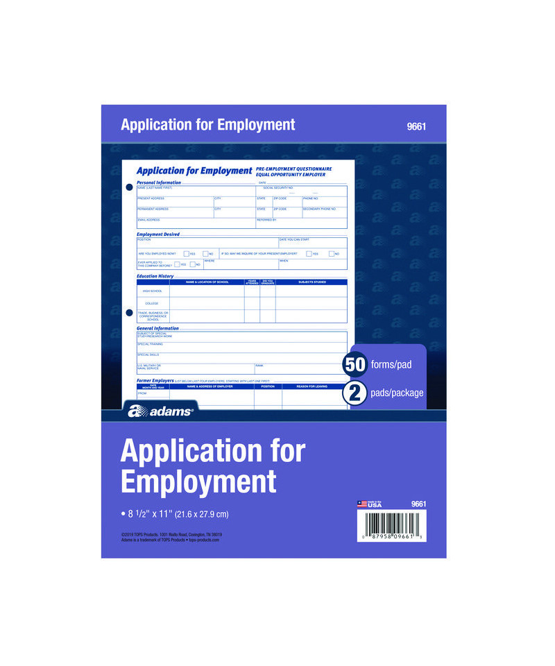 Get contact information, employment history and other information from applicants with these letter-size employment application forms. Make applying for employment simple. Each form is printed in English for convenience, while the three-hole-punched edge lets you conveniently insert them into any standard three-ring binder. These Adams® employment application forms comply with all legal requirements.