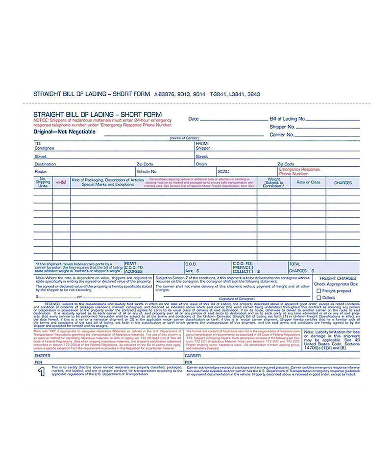 Adaptable to most types of shipments to any location in the United States, these simplified, short forms provide space to itemize several articles. Dedicated columns are provided for shipping units, hazardous materials indicators, article descriptions, shipping weights, rate/class codes and charges. Carbonless, multi-part format.