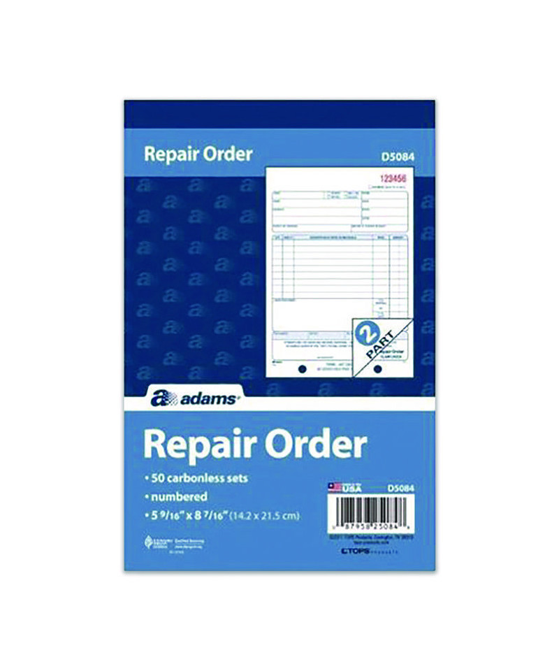 Ideal for a wide variety of repair orders and associated estimates, Adams® Multipart Repair Order Pads provide large areas for itemized parts/materials and labor cost descriptions as well as dedicated areas for the important administrative aspects. Carbonless, multipart design allows you provide a copy to your customer while keeping clean copies for your records. For your customer's convenience, the last copy of each set also features a perforated claim check; and for your convenience, the pad's wraparound cover allows you to place the front cover between sets as you fill out a form, minimizing the potential for write-through.
