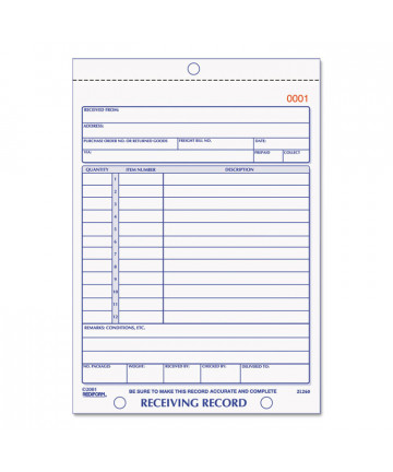 Add to cart Receiving Record Book, Three-Part Carbonless, 5.56 x... $14.65 Details items received and their condition. 12 listing lines. Consecutively numbered. Wrap-around stop card prevents write-through to other form...
