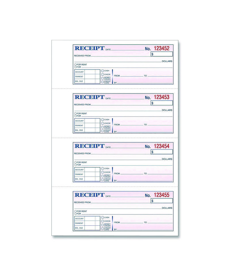 Add to cart Money/Rent Receipt Book, Two-Part Carbonless, 6.69 x... $4.33 Use for rent or any other type of payment. 2-part (white, canary paper sequence). Consecutively numbered within each book.