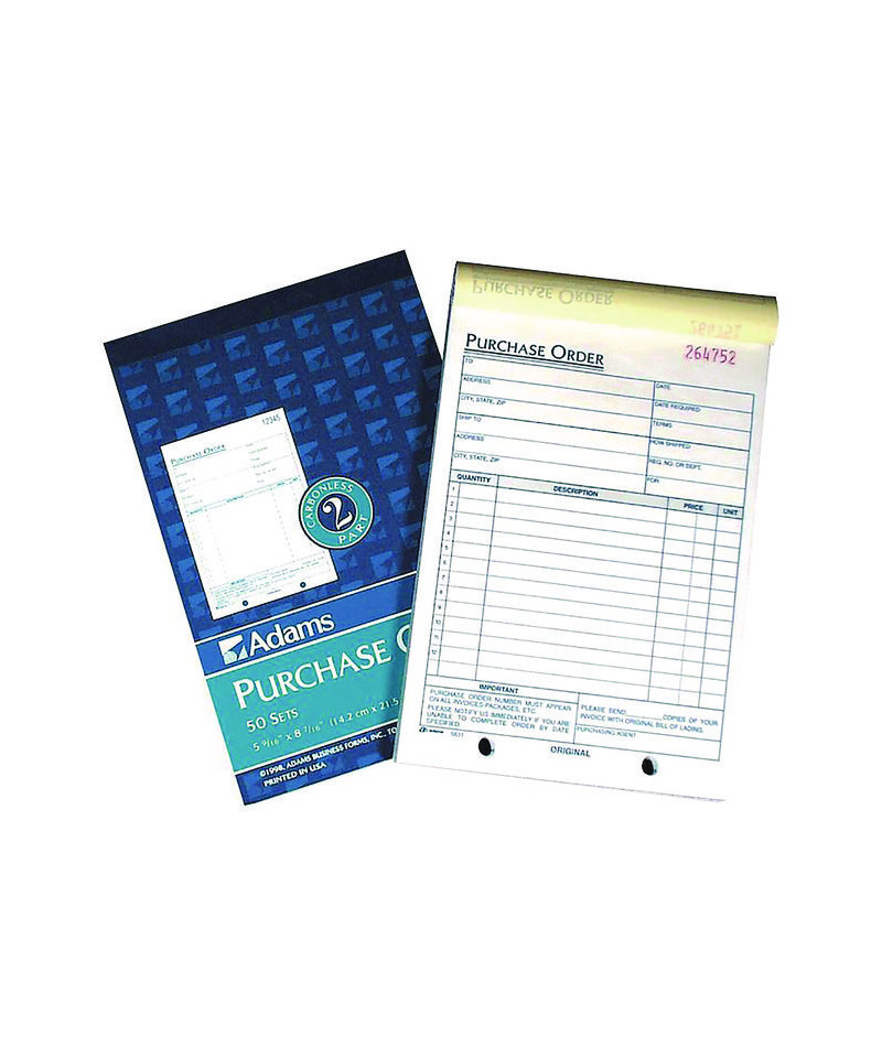 Easily keep hard copy records of each purchase order. Preprinted layout features prompts for all the important details—purchaser, ship-to and administrative information as well as itemized order details. Carbonless, multipart format with a wraparound cover—place the cover between sets to minimize the potential for write-through.