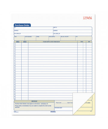 Easily keep hard copy records of each purchase order. Preprinted layout features prompts for all the important details—purchaser, ship-to and administrative information as well as itemized order details. Carbonless, multipart format with a wraparound cover—place the cover between sets to minimize the potential for write-through.