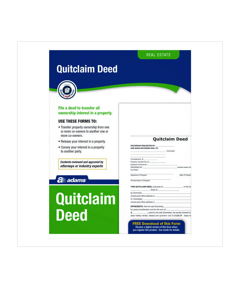 Save time and money by cutting out the legalese and attorney's fees. Reviewed and approved by attorneys and industry experts, Adams® Quitclaim Deed Forms with Instructions & Free Downloads give you everything needed for one or more owners to transfer ownership of property and property rights without warranties against liens, which is particularly useful where properties are transferred as a gift, transferred between family members and transferred from individuals to an associated business entity. Simple, step-by-step instructions streamline the process for filing quitclaim agreements. Valid in all 50 states—additional materials required for the states of CA, FL, IL, MD, ND, NY and TX are included as a free download.