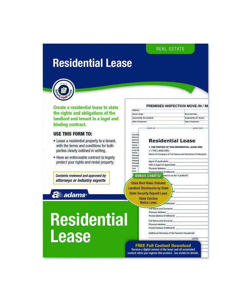 Create legally binding leases within your state without legalese or legal fees. Reviewed and approved by attorneys and industry experts, Adams® Residential Lease Form Sets provide everything needed to specify the rights and obligations of the landlord and tenant. In addition to a hard copy of the four-form set, simple, step-by-step instructions and a glossary of all relevant legal terms as well as digital downloads of the residential rental laws in each state and a digital copy of the printable four-form set are also included. Simply register the product with Adams® using the included authorization code and receive your free downloads. Developed with NOLO, the premium provider of DIY legal books and resources.