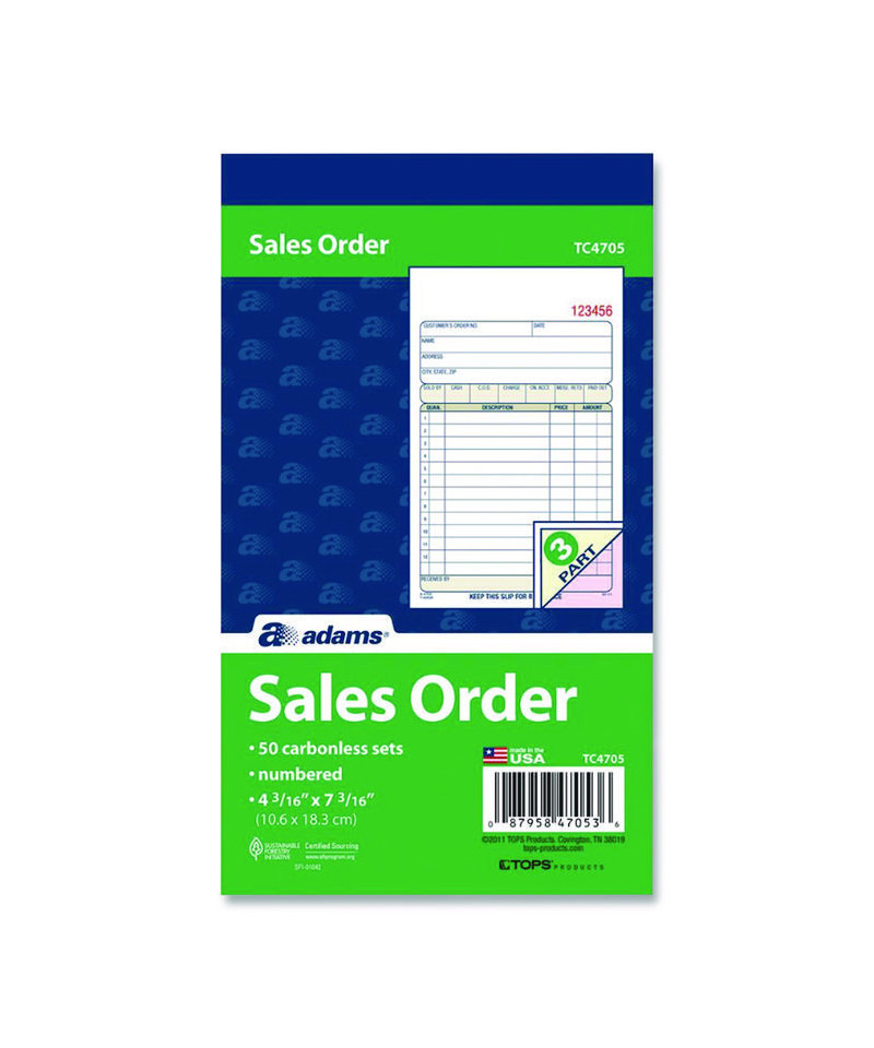 Perfect for keeping hard copy records of your sales, the Adams® Multipart Sales Order Pad features preprinted layout prompts for all the important details. With entry areas for point of sale, customer, order, terms information and more, anything one might wish to capture can easily be accommodated. Open area at top provides space for your company's logo, and the order form's carbonless, multipart format lets you provide a receipt to your customer while keeping clean, administrative copies. The pad's wraparound cover also allows you to place the front cover between sets as you fill out a form, minimizing the potential for write-through.