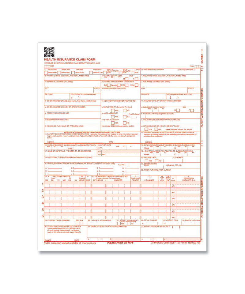 Meet billing requirements for Medicare Part B. Easy-to-read forms with crisp, clean text help ensure faster claims processing. Paper, layout and ink comply with CMS standards and requirements. Layout includes all 02/12 NUCC revisions and is a direct replacement for the previous 08/05 version. Printed in scannable, OCR "dropout" red ink.
