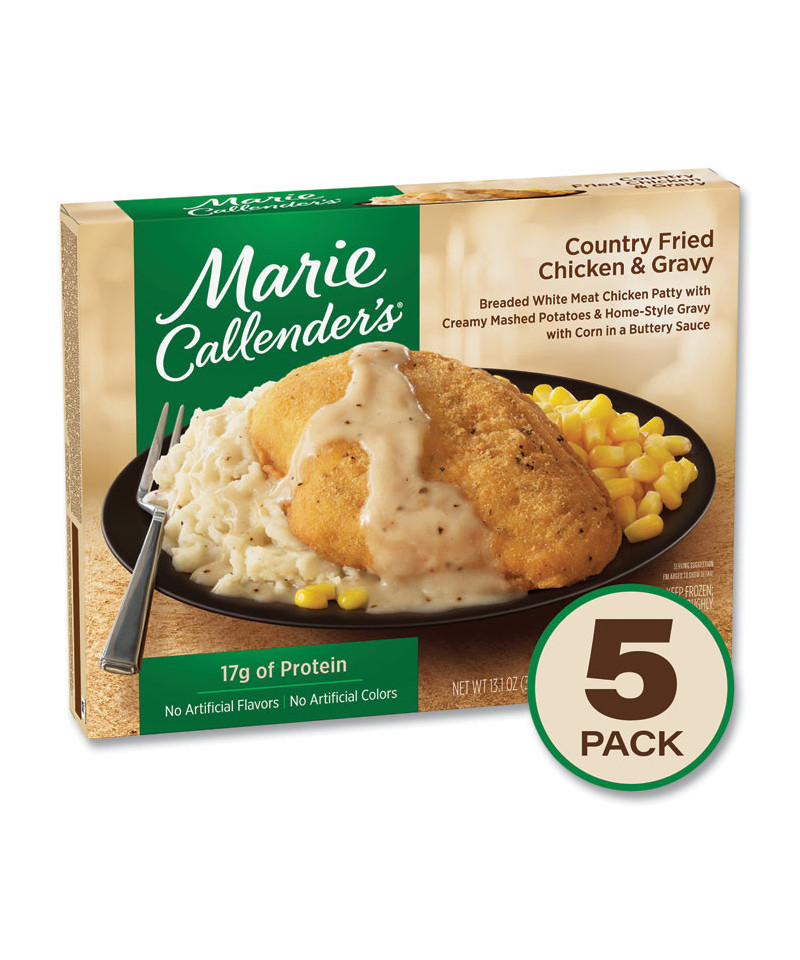A 5-pack of Marie Callender's® Country Fried Chicken and Gravy bowls. Enjoy a breaded white-meat chicken patty, creamy mashed potatoes with homestyle gravy, and corn in a tasty, buttery sauce. This flavorful dish contains 17 grams of protein and no artificial flavors or colors. A convenient microwavable meal you can enjoy in minutes. Comfort food meals you know and love ready when you need them.