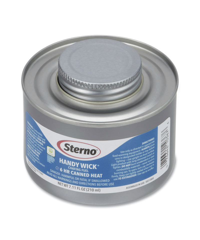 Handy Wick® chafing fuel cans stay cool even after lit to ensure safe handling. With their handy twist cap, they are easily resealable and reusable. They provide a reliable burn time with a maximum temperature of 170 degrees Fahrenheit. They come in safe, spill-proof packaging and are ideal for large beverage urns and soup tureens.
