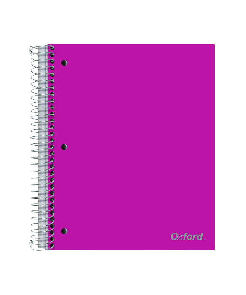 This Oxford five-subject poly notebook comes in bright colors and is three-hole punched to fit a standard binder. Includes five poly divider pockets and a strong no-snag coil. Comes in assorted colors.
